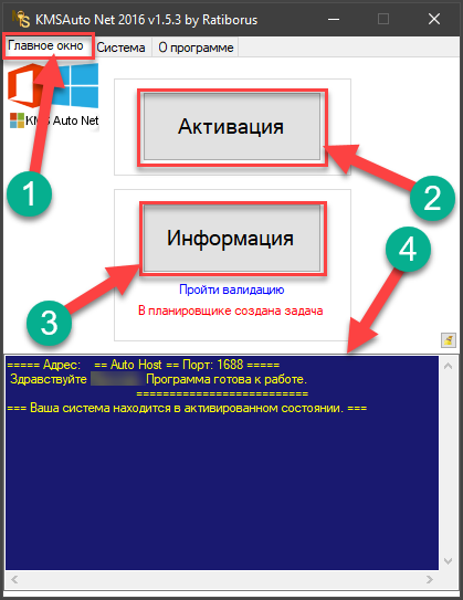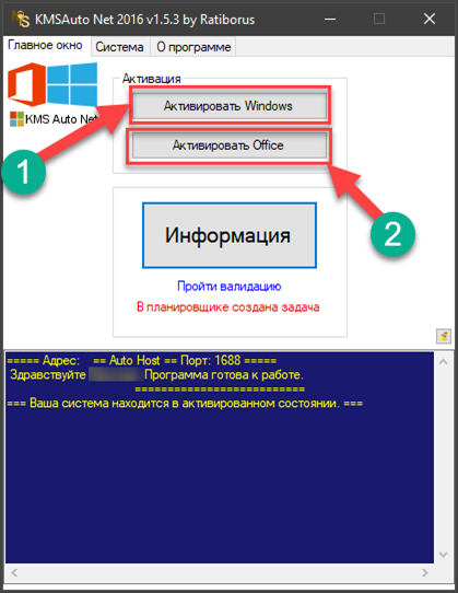 На главной панели стоят клавиши «Информация» и «Активация». В консоли, как говорилось выше, транслируется процесс. В разделе «Системы» выводятся кнопки ручной установки: