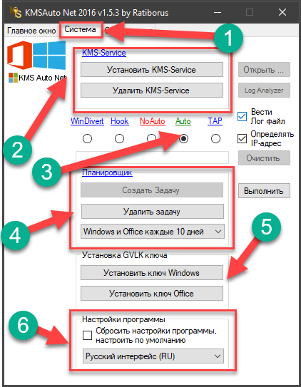 Активация Виндовс и приложений Office происходит автоматически, всего лишь кликом по одной клавише. Юзеру не требуется проводить настройки. Есть и ручной режим, управление для которого находится во вкладке «Системы». Здесь можно как на 100 % контролировать процесс, настраивая параметры и выполняя раздельную установку для Windows и офисных ПО, так и изменить параметры выборочно.